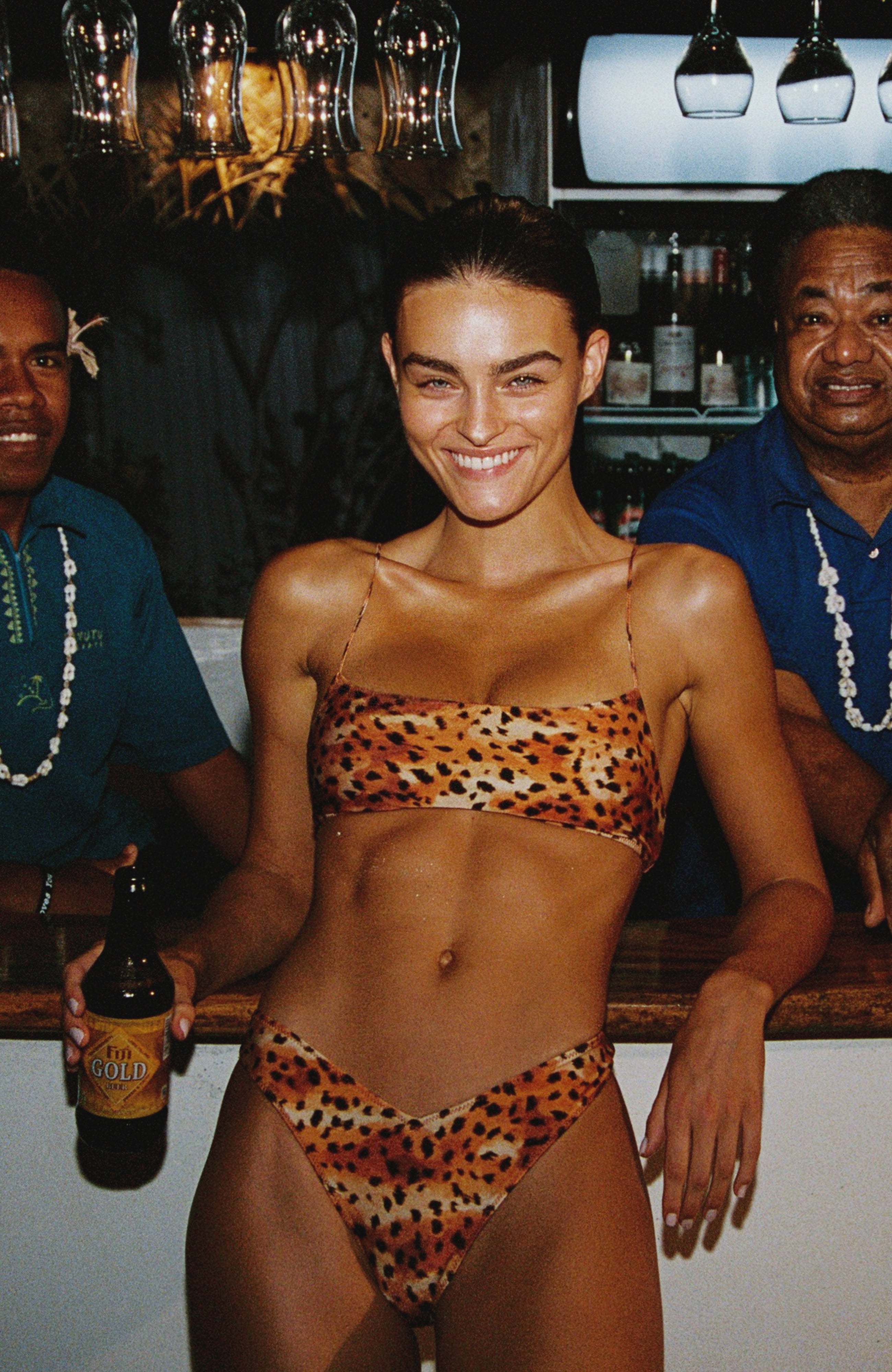 Model wearing a leopard print bikini in a bar setting